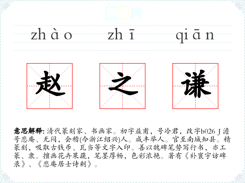 1.清代篆刻家、书画家。初字益甫,号冷君,改字b026J澹号悲庵、无闷,会稽(今浙江绍兴)人。咸丰举人。官至南城知县。精篆刻,吸取古钱币、瓦当等文字入印。善以魏碑笔势写行书,亦工篆、隶。擅画花卉果蔬,笔墨厚畅,色彩浓艳。著有《补寰宇访碑录》、《悲庵居士诗剩》。