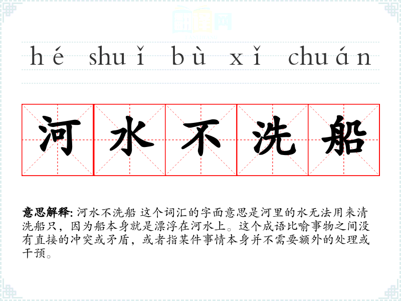 河水不洗船 这个词汇的字面意思是河里的水无法用来清洗船只,因为船本身就是漂浮在河水上。这个成语比喻事物之间没有直接的冲突或矛盾,或者指某件事情本身并不需要额外的处理或干预。