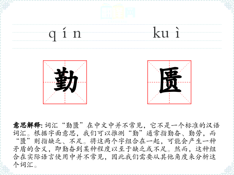 由于“勤匮”不是一个标准词汇,我们无法给出一个确切的基本定义。但可以根据字面意思推测,它可能指的是过度勤奋导致资源或精力的不足。