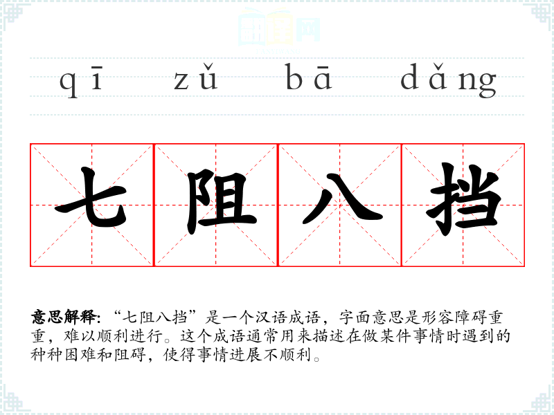 “七阻八挡”是一个汉语成语,字面意思是形容障碍重重,难以顺利进行。这个成语通常用来描述在做某件事情时遇到的种种困难和阻碍,使得事情进展不顺利。