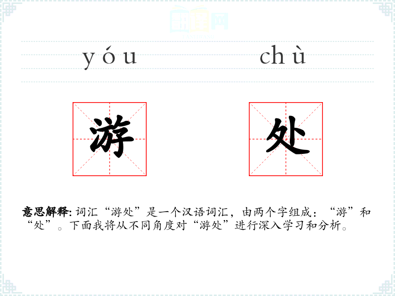 词汇“游处”是一个汉语词汇,由两个字组成:“游”和“处”。下面我将从不同角度对“游处”进行深入学*和分析。