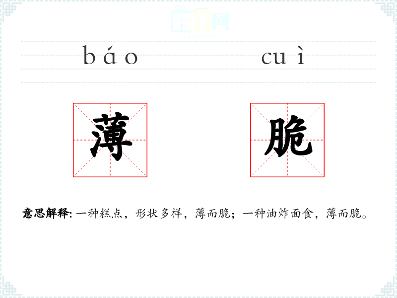 一种糕点,形状多样,薄而脆;一种油炸面食,薄而脆。