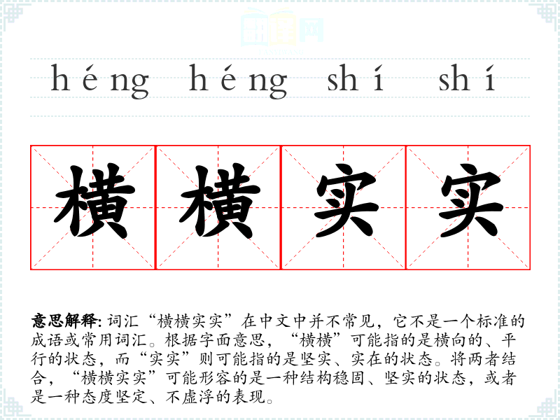 词汇“横横实实”在中文中并不常见,它不是一个标准的成语或常用词汇。根据字面意思,“横横”可能指的是横向的、平行的状态,而“实实”则可能指的是坚实、实在的状态。将两者结合,“横横实实”可能形容的是一种结构稳固、坚实的状态,或者是一种态度坚定、不虚浮的表现。