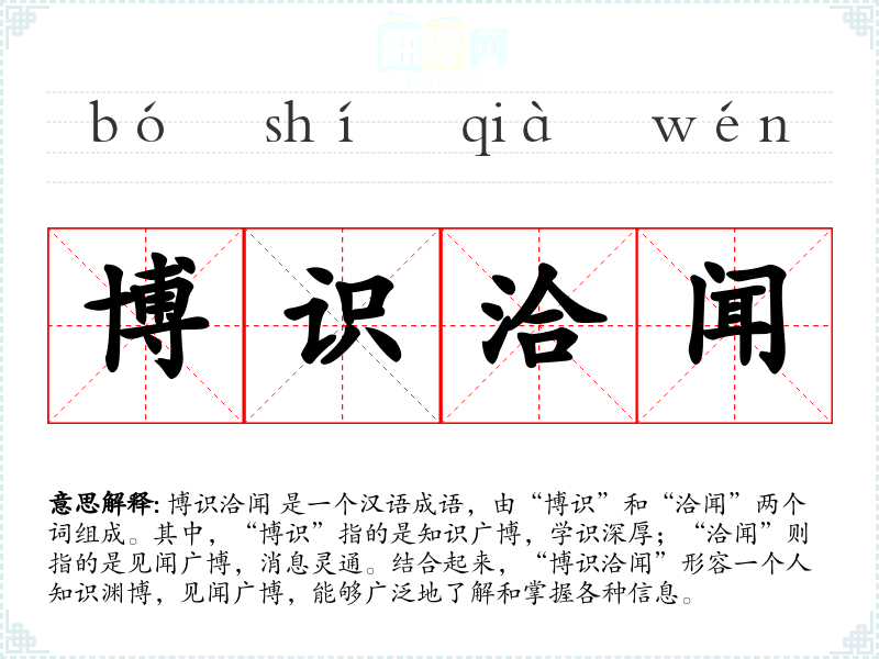 博识洽闻 是一个汉语成语,由“博识”和“洽闻”两个词组成。其中,“博识”指的是知识广博,学识深厚;“洽闻”则指的是见闻广博,消息灵通。结合起来,“博识洽闻”形容一个人知识渊博,见闻广博,能够广泛地了解和掌握各种信息。