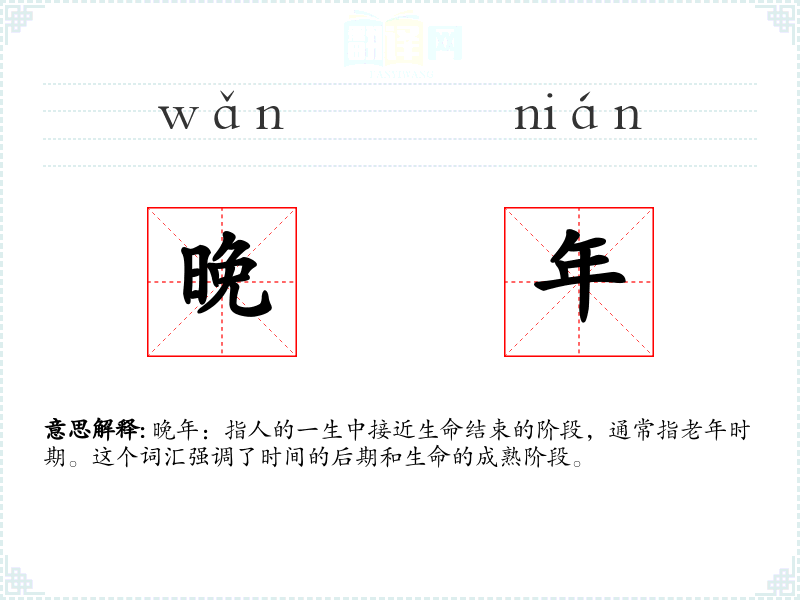 晚年:指人的一生中接近生命结束的阶段,通常指老年时期。这个词汇强调了时间的后期和生命的成熟阶段。