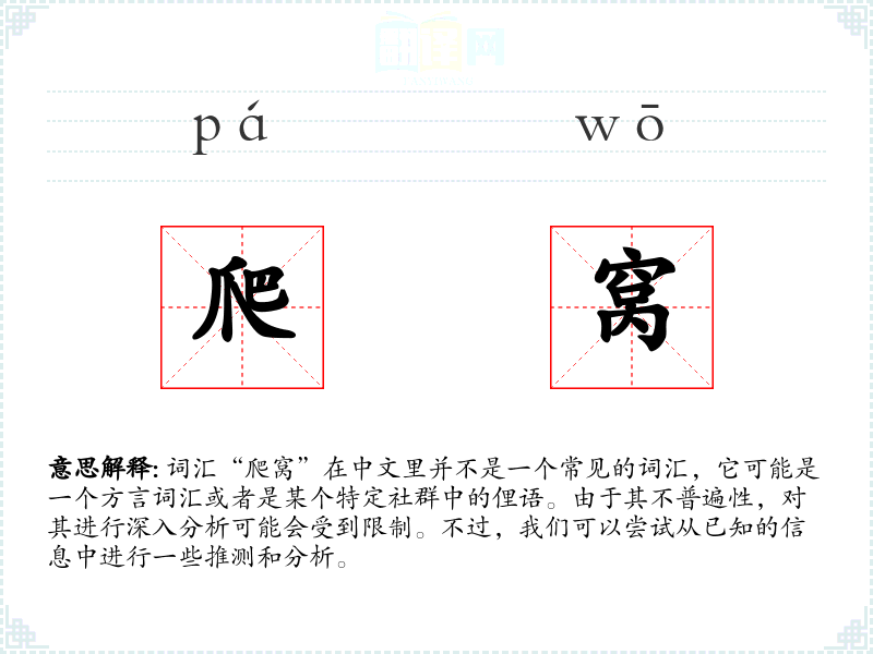 由于“爬窝”不是一个普遍的词汇,它在不同语言或文化中的对应词汇可能不存在,或者对应词汇的意义和使用情况会有所不同。