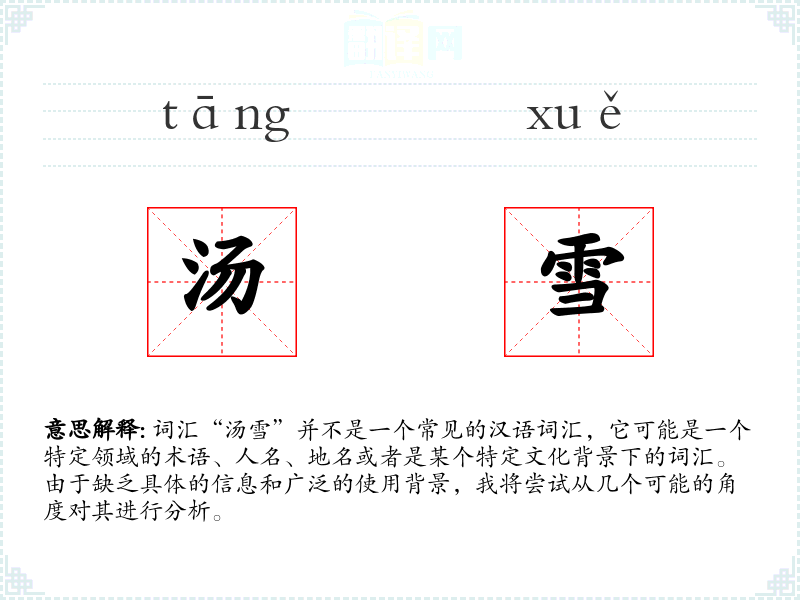 词汇“汤雪”并不是一个常见的汉语词汇,它可能是一个特定领域的术语、人名、地名或者是某个特定文化背景下的词汇。由于缺乏具体的信息和广泛的使用背景,我将尝试从几个可能的角度对其进行分析。