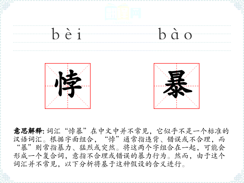 词汇“悖暴”在中文中并不常见,它似乎不是一个标准的汉语词汇。根据字面组合,“悖”通常指违背、错误或不合理,而“暴”则常指暴力、猛烈或突然。将这两个字组合在一起,可能会形成一个复合词,意指不合理或错误的暴力行为。然而,由于这个词汇并不常见,以下分析将基于这种假设的含义进行。