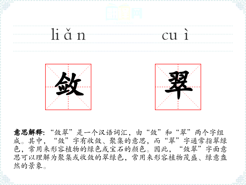 在**传统文化中,绿色常被赋予生机、和谐和自然的象征意义。因此,“敛翠”这个词汇在文学作品中常用来表达对自然美的赞美和对生命力的颂扬。