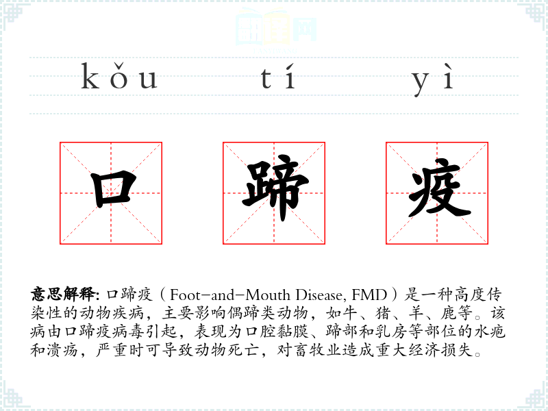 - 口语:在日常对话中,口蹄疫通常是一个专业术语,非专业人士可能不太熟悉。