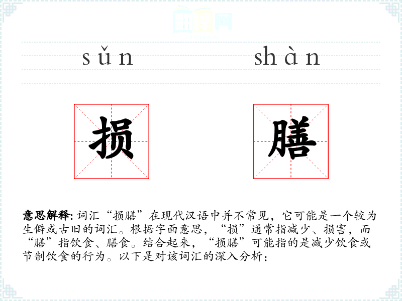 - 词源:可能源自古代汉语,其中“损”和“膳”都是古代常用的词汇。