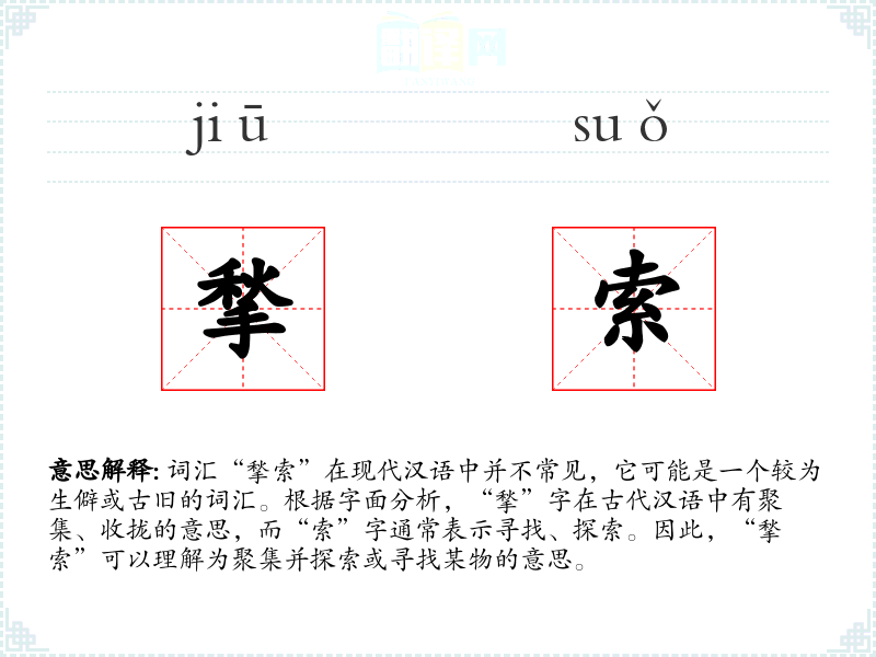 词汇“揫索”在现代汉语中并不常见,它可能是一个较为生僻或古旧的词汇。根据字面分析,“揫”字在古代汉语中有聚集、收拢的意思,而“索”字通常表示寻找、探索。因此,“揫索”可以理解为聚集并探索或寻找某物的意思。