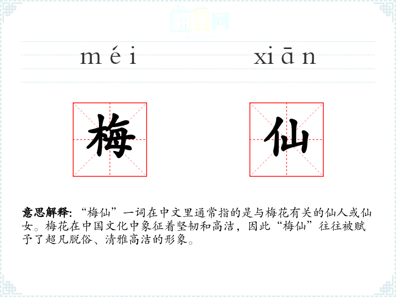 - 口语:在日常口语中,“梅仙”可能不常用,但在谈论**传统文化或花卉时可能会提及。