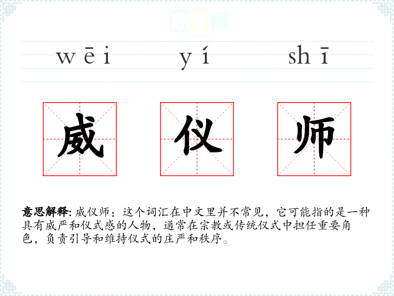 威仪师:这个词汇在中文里并不常见,它可能指的是一种具有威严和仪式感的人物,通常在**或传统仪式中担任重要角色,负责引导和维持仪式的庄严和秩序。