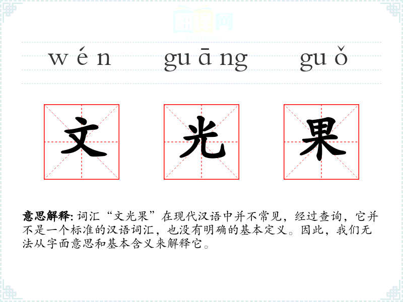 词汇“文光果”在现代汉语中并不常见,经过查询,它并不是一个标准的汉语词汇,也没有明确的基本定义。因此,我们无法从字面意思和基本含义来解释它。
