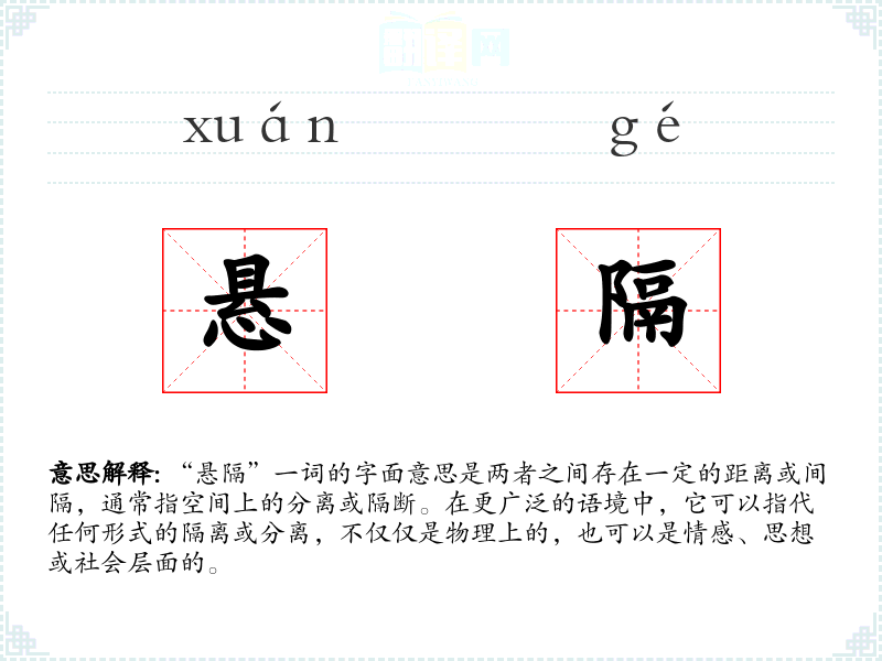 “悬隔”一词的字面意思是两者之间存在一定的距离或间隔,通常指空间上的分离或隔断。在更广泛的语境中,它可以指代任何形式的隔离或分离,不仅仅是物理上的,也可以是情感、思想或社会层面的。