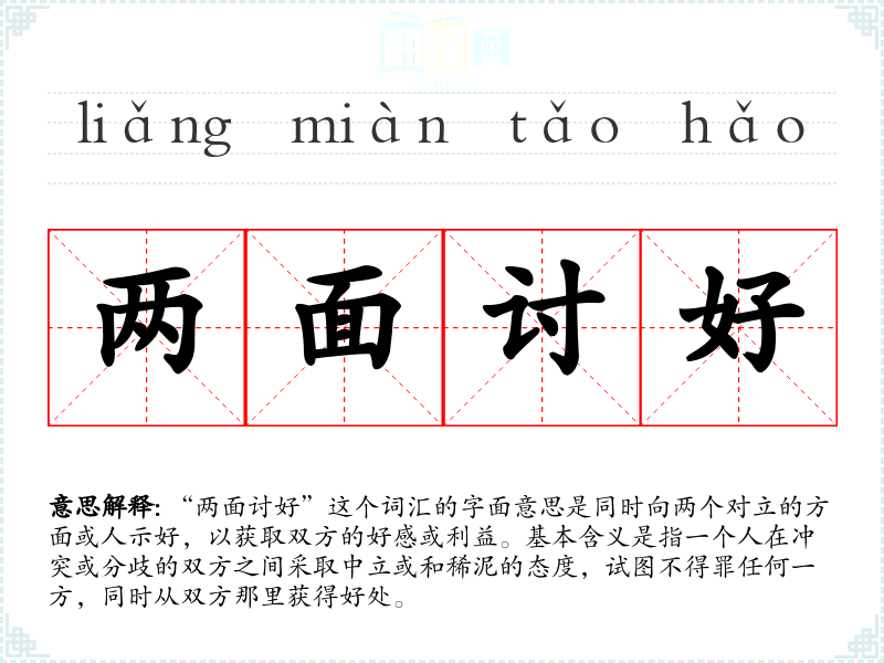 “两面讨好”这个词汇的字面意思是同时向两个对立的方面或人示好,以获取双方的好感或利益。基本含义是指一个人在冲突或分歧的双方之间采取中立或和稀泥的态度,试图不得罪任何一方,同时从双方那里获得好处。
