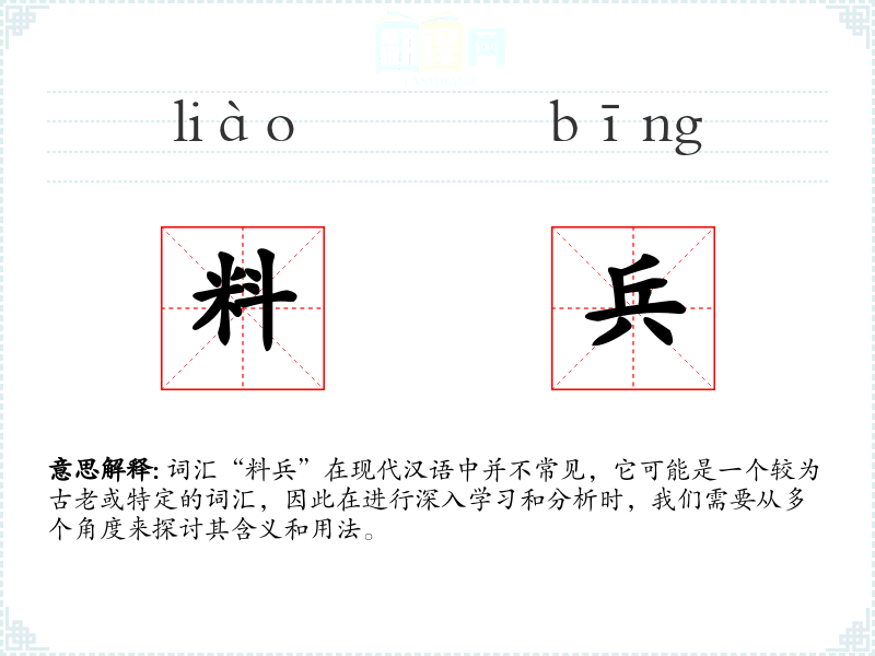 “料”字在古代有估计、预测的意思,“兵”指兵力或军队。这个词汇可能源自古代军事文献,随着时间的推移,其使用频率可能有所下降。