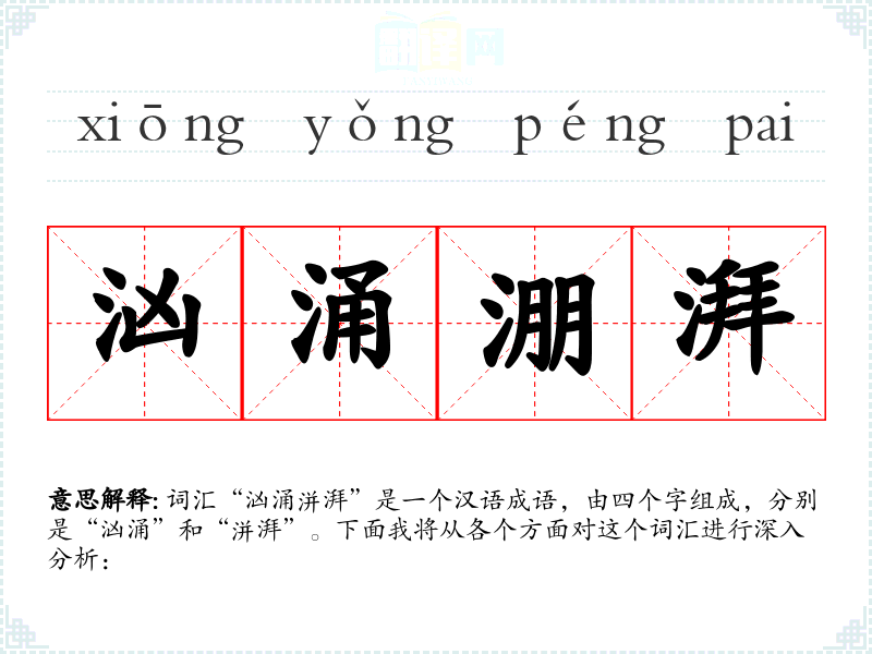 词汇“汹涌洴湃”是一个汉语成语,由四个字组成,分别是“汹涌”和“洴湃”。下面我将从各个方面对这个词汇进行深入分析:
