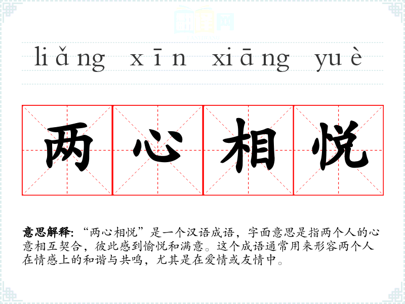 “两心相悦”是一个汉语成语,字面意思是指两个人的心意相互契合,彼此感到愉悦和满意。这个成语通常用来形容两个人在情感上的和谐与共鸣,尤其是在爱情或友情中。