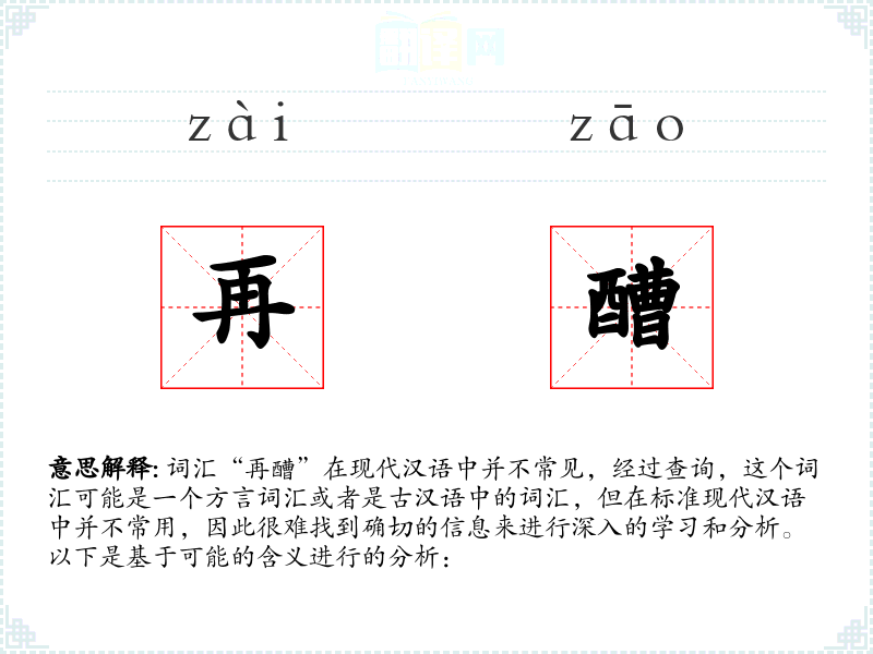 由于“再醩”不是一个常见的词汇,我们无法提供一个确切的基本定义。如果“醩”是指酒或者酒糟,那么“再醩”可能意味着再次酿酒或者再次使用酒糟。