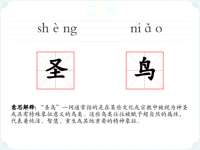 - 反义词:凡鸟、俗鸟(这些词汇并不常见,但可以用来表示与“圣鸟”相对的普通或不具特殊意义的鸟类)