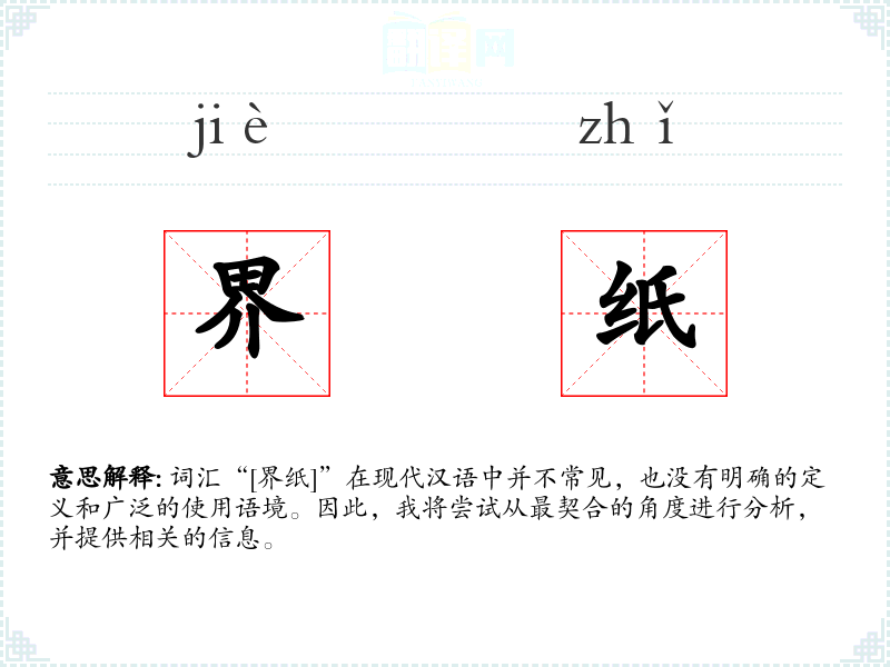 由于“界纸”不是一个标准的汉语词汇,我们无法提供一个确切的基本定义。它可能是由“界”和“纸”两个字组合而成的,但具体含义不明。
