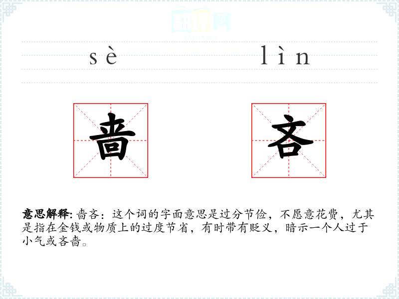 啬吝:这个词的字面意思是过分节俭,不愿意花费,尤其是指在金钱或物质上的过度节省,有时带有贬义,暗示一个人过于小气或吝啬。