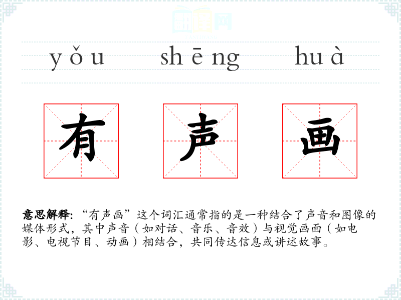 “有声画”这个词汇通常指的是一种结合了声音和图像的媒体形式,其中声音(如对话、音乐、音效)与视觉画面(如电影、电视节目、动画)相结合,共同传达信息或讲述故事。