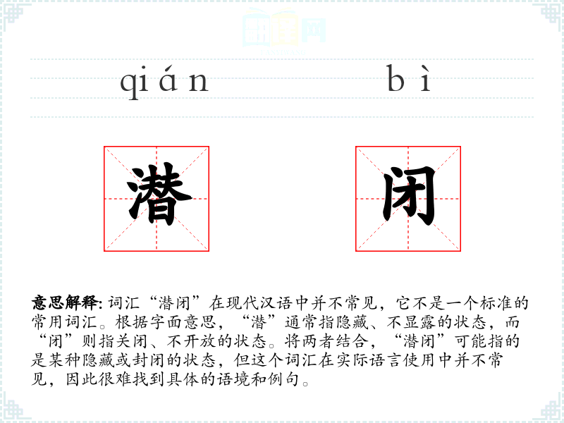 创造性使用方面,由于“潜闭”不是一个常用词汇,将其融入到诗歌、故事或其他创作中的可能性有限。但如果要尝试,可以考虑在描述某种隐藏或封闭的情境时使用这个词汇。