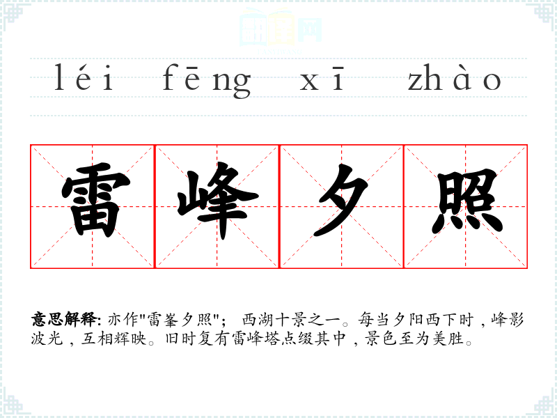 亦作"雷峯夕照"; 西湖十景之一。每当