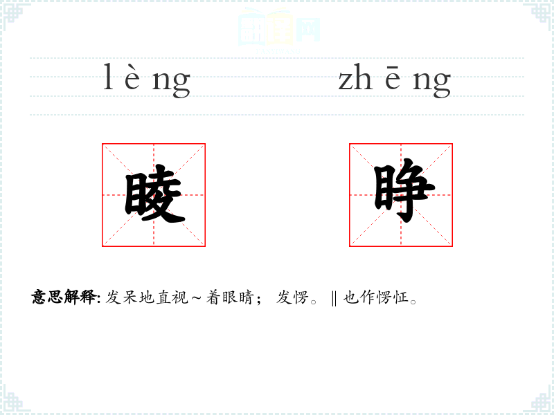 发呆地直视~着眼睛; 发愣。‖也作愣怔。