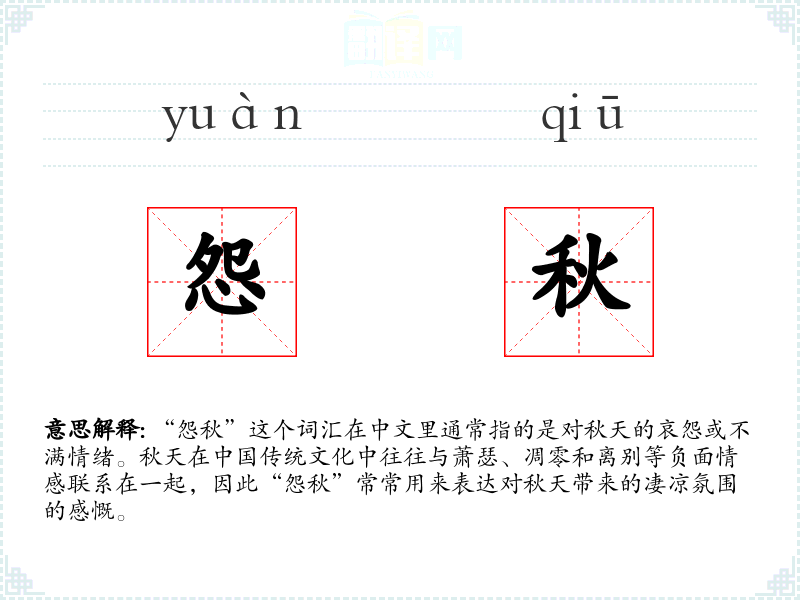 “怨秋”这个词汇的词源较为直接,由“怨”和“秋”两个字组成,分别表示不满和秋天。在古代文学中,这个词汇就已经出现,用以表达对秋天特定情感的描述。随着时间的推移,其使用范围和情感色彩有所扩展,但基本含义保持不变。