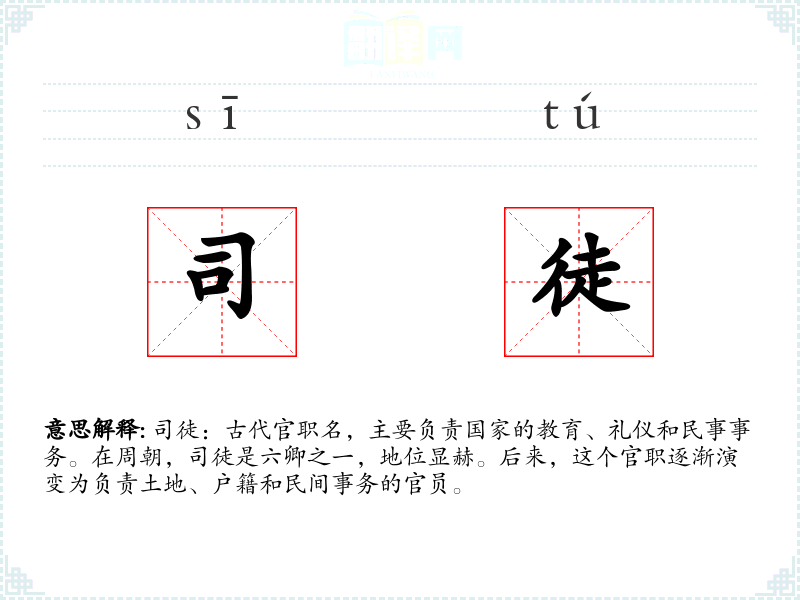 - 词源:司徒一词源于古代汉语,由“司”(管理)和“徒”(徒众,指民众)组成。