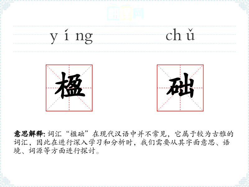词汇“楹础”在现代汉语中并不常见,它属于较为古雅的词汇,因此在进行深入学*和分析时,我们需要从其字面意思、语境、词源等方面进行探讨。