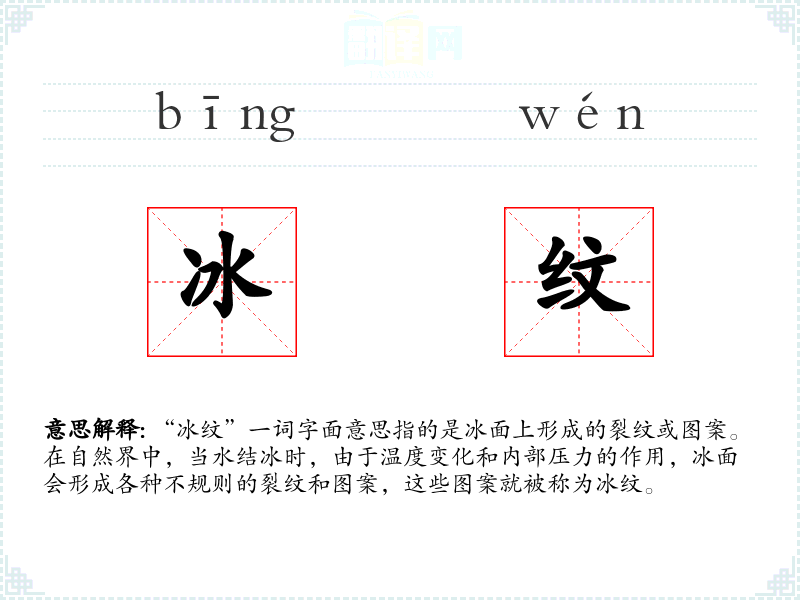 “冰纹”一词字面意思指的是冰面上形成的裂纹或图案。在自然界中,当水结冰时,由于温度变化和内部压力的作用,冰面会形成各种不规则的裂纹和图案,这些图案就被称为冰纹。