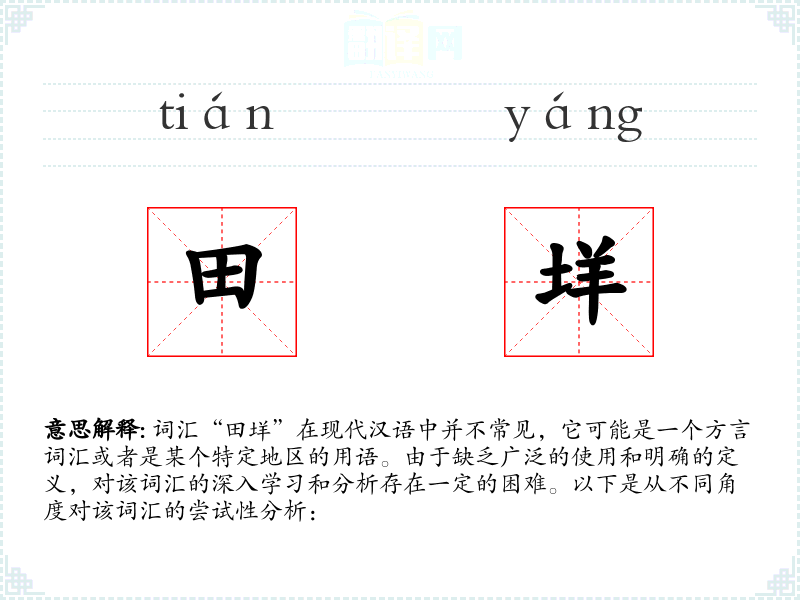 词汇“田垟”在现代汉语中并不常见,它可能是一个方言词汇或者是某个特定地区的用语。由于缺乏广泛的使用和明确的定义,对该词汇的深入学习和分析存在一定的困难。以下是从不同角度对该词汇的尝试性分析: