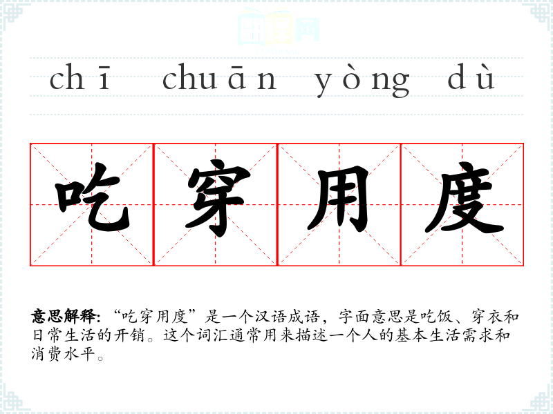 “吃穿用度”是一个汉语成语,字面意思是吃饭、穿衣和日常生活的开销。这个词汇通常用来描述一个人的基本生活需求和消费水平。