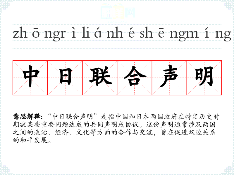 “中日联合声明”是一个重要的政治词汇,它不仅反映了中日两国关系的现状,也预示着未来的发展方向。在我的语言学*和表达中,理解这个词汇的深层含义对于把握国际政治动态至关重要。