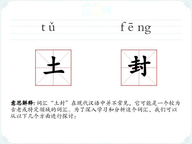 词汇“土封”在现代汉语中并不常见,它可能是一个较为古老或特定领域的词汇。为了深入学*和分析这个词汇,我们可以从以下几个方面进行探讨: