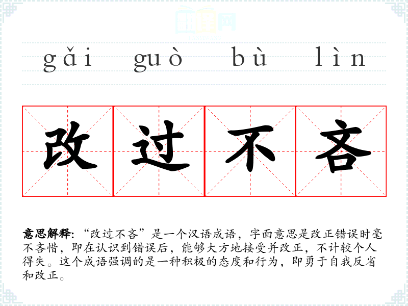 在**传统文化中,“改过不吝”体现了儒家思想中的“修身齐家治国平天下”的理念,强调个人品德的修养和自我完善。在现代社会,这个成语仍然被广泛应用于教育、管理和个人成长等领域。