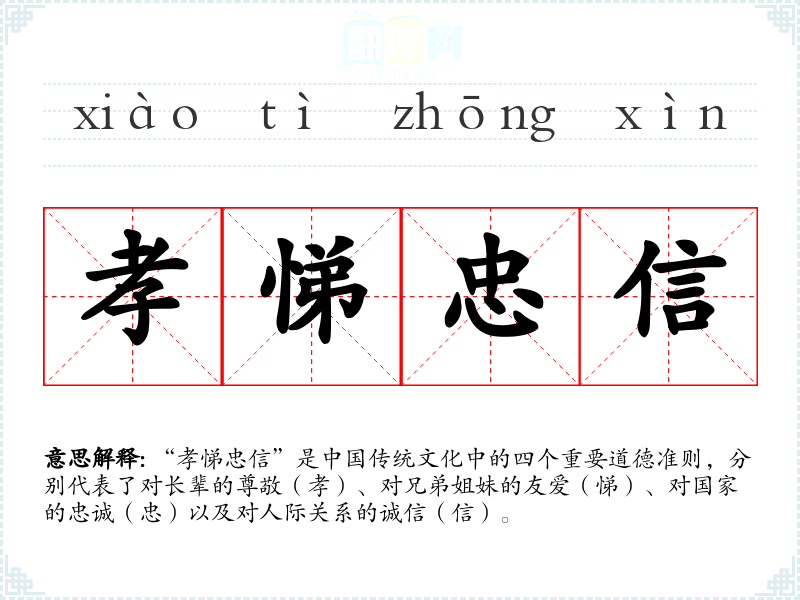 “孝悌忠信”是中国传统文化中的四个重要道德准则,分别代表了对长辈的尊敬(孝)、对兄弟姐妹的友爱(悌)、对国家的忠诚(忠)以及对人际关系的诚信(信)。