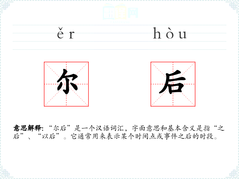 “尔后”源自古代汉语,其中“尔”是代词,意为“你”或“你的”,在“尔后”中用作副词,表示“之后”。随着时间的推移,“尔后”逐渐固定为一个表示时间顺序的词汇。