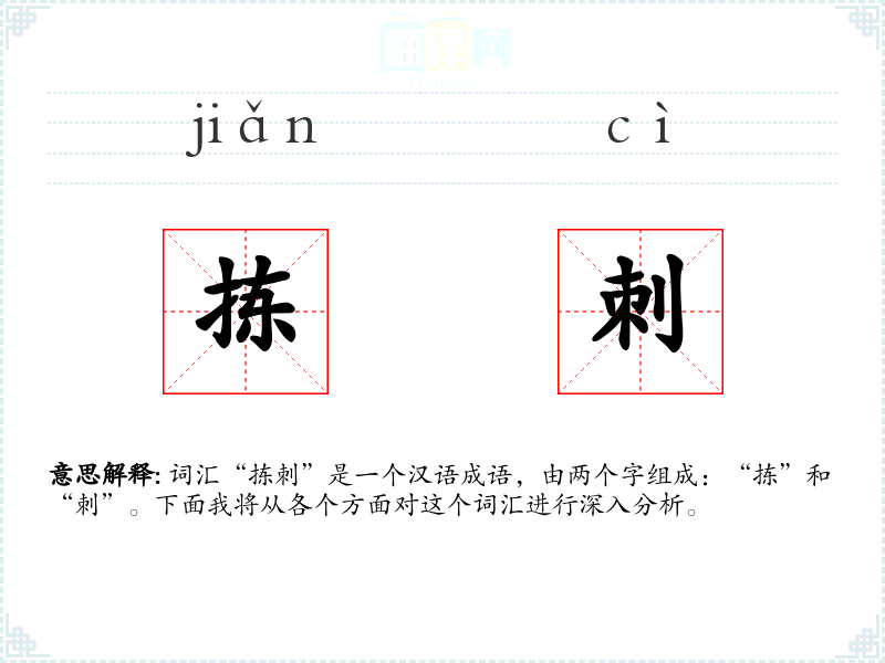 词汇“拣刺”是一个汉语成语,由两个字组成:“拣”和“刺”。下面我将从各个方面对这个词汇进行深入分析。