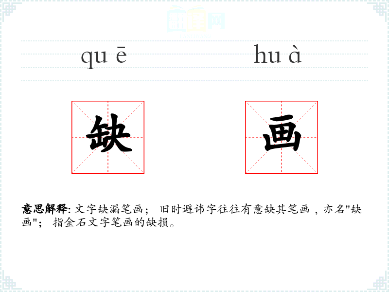 文字缺漏笔画; 旧时避讳字往往有意缺其笔画﹐亦名"缺画"; 指金石文字笔画的缺损。