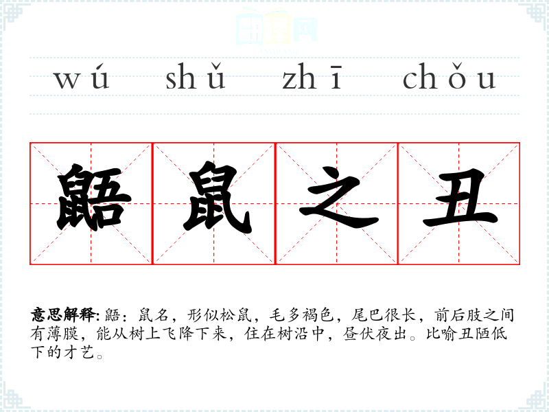 鼯:鼠名,形似松鼠,毛多褐色,尾巴很长,前后肢之间有薄膜,能从树上飞降下来,住在树沿中,昼伏夜出。比喻丑陋低下的才艺。