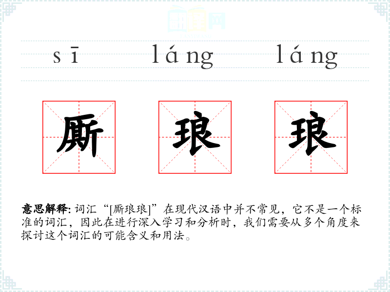 由于“[厮琅琅]”不是一个标准词汇,我们无法给出一个确切的字面意思和基本含义。它可能是由两个字组合而成的,但这种组合在现代汉语中没有明确的意义。