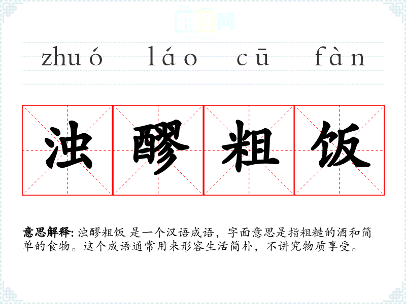 浊醪粗饭 是一个汉语成语,字面意思是指粗糙的酒和简单的食物。这个成语通常用来形容生活简朴,不讲究物质享受。