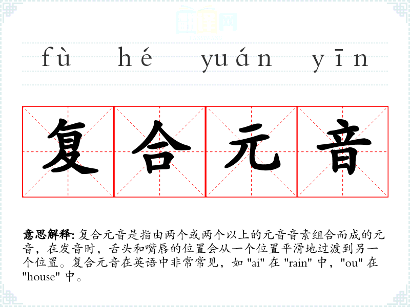 复合元音是指由两个或两个以上的元音音素组合而成的元音,在发音时,舌头和嘴唇的位置会从一个位置平滑地过渡到另一个位置。复合元音在英语中非常常见,如 "ai" 在 "rain" 中,"ou" 在 "house" 中。