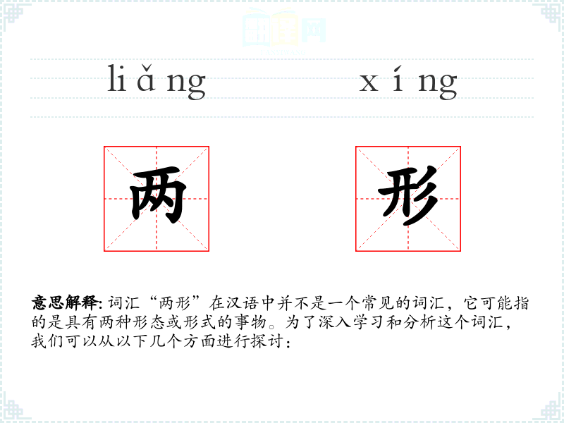 词汇“两形”在汉语中并不是一个常见的词汇,它可能指的是具有两种形态或形式的事物。为了深入学习和分析这个词汇,我们可以从以下几个方面进行探讨: